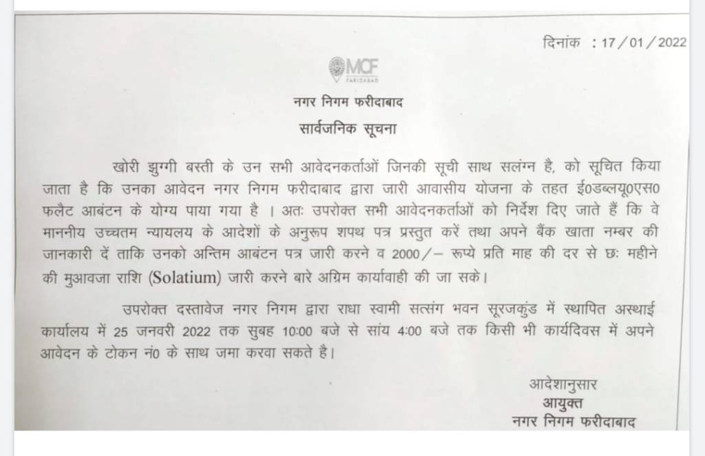 खोरी झुग्गी बस्सी के उन सभी आवेदनकर्ताओं जिन की सूची दी गई है, को सूचित किया जाता है कि उनका आवेदन नगर निगम फरीदाबाद द्वारा जारी आवासीय योजना के तहत फ्लैट आवंटन के योग्य पाया गया है।