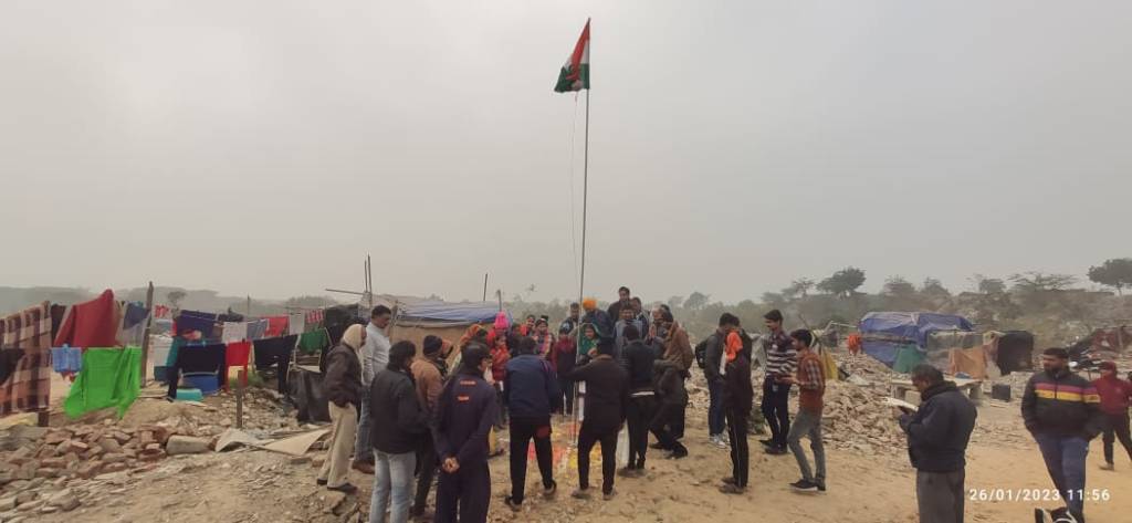 26 जनवरी 2023 संविधान दिवस पर तिरंगा झंडा फहराया गया, खोरी गांव के विध्वंस को खोरी वासियों समेत द्वारा याद किया गया ।