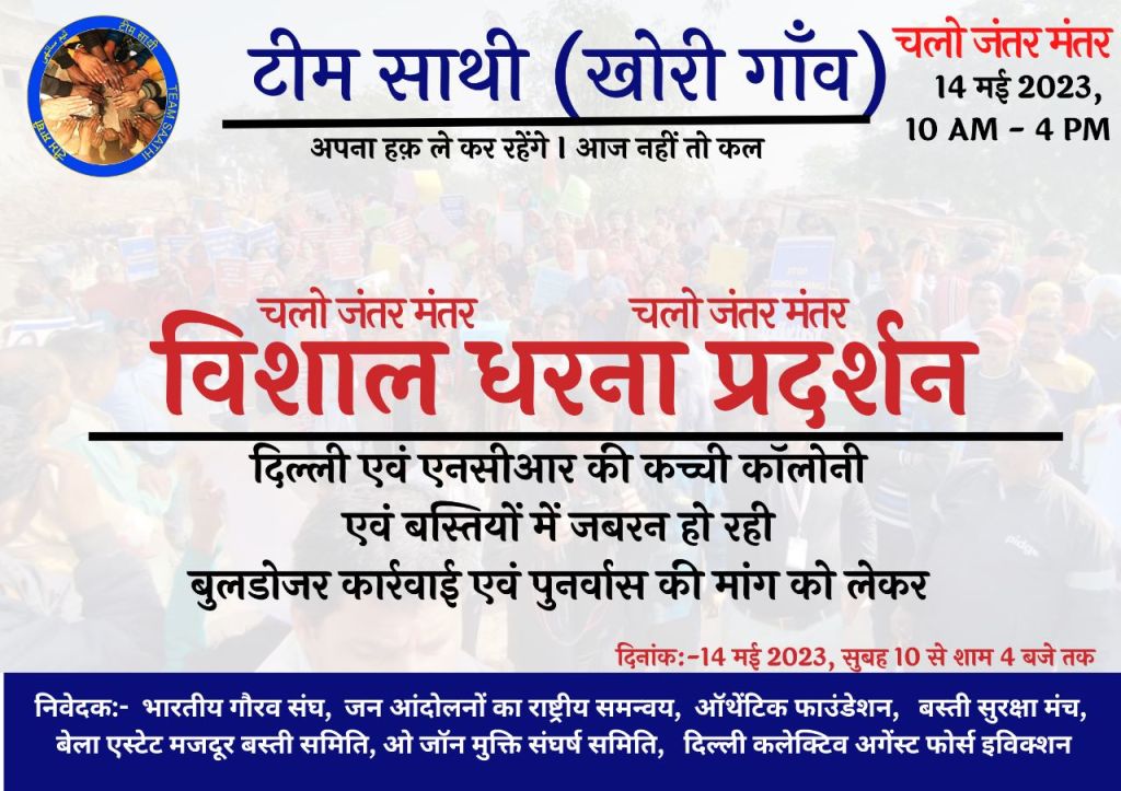 दिल्ली और एन.सी.आर में हो रही जबरन बेदखली के विरोध में और पर्याप्त पुनर्वास की मांग को लेकर जंतर-मंतर पर एक दिन का विशाल धरना प्रदर्शन, 14 मई