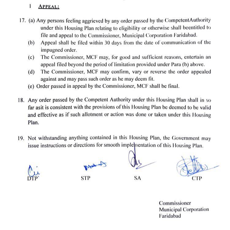 (a) कोई भी व्यक्ति जो पात्रता या अन्यथा से संबंधित प्राधिकारी द्वारा पारित किसी आदेश से संतुष्ट नहीं है, वह आयुक्त, नगर निगम फरीदाबाद के पास अपील दायर कर सकता है।